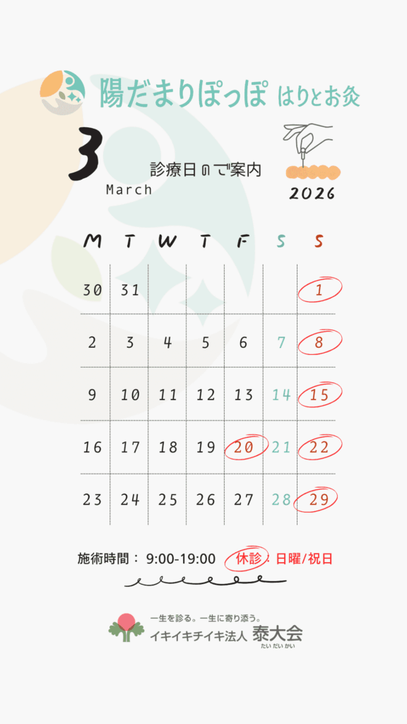 季節の変わり目、花粉症の鍼灸など、お身体のメンテナンスにぜひお役立てください。